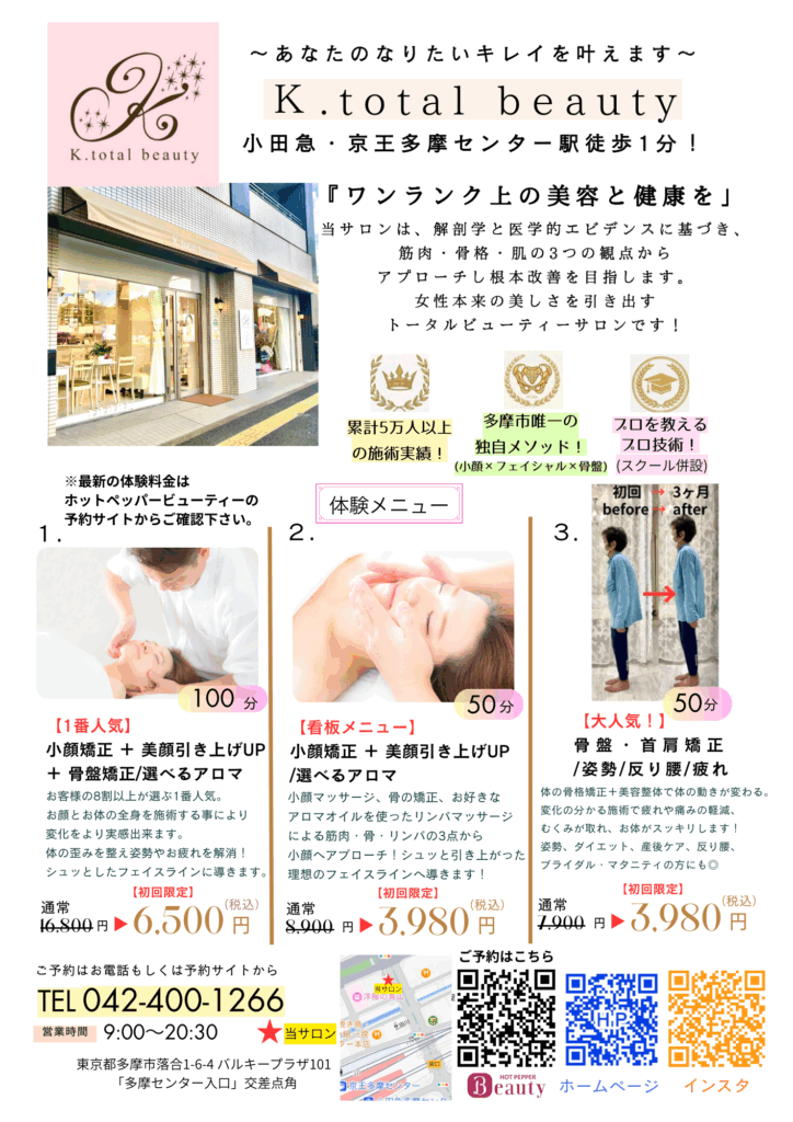 K.total beautyは、多摩地区唯一の小顔・骨盤・O脚の各矯正、ENVIRONエステティック・コスメ、INDIBA、Power Plateによるトータルビューティーを提供しています。